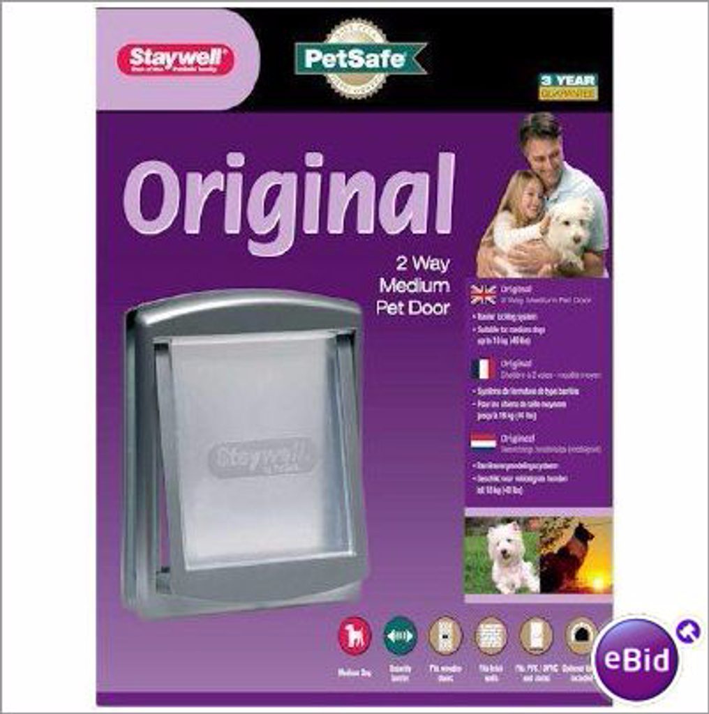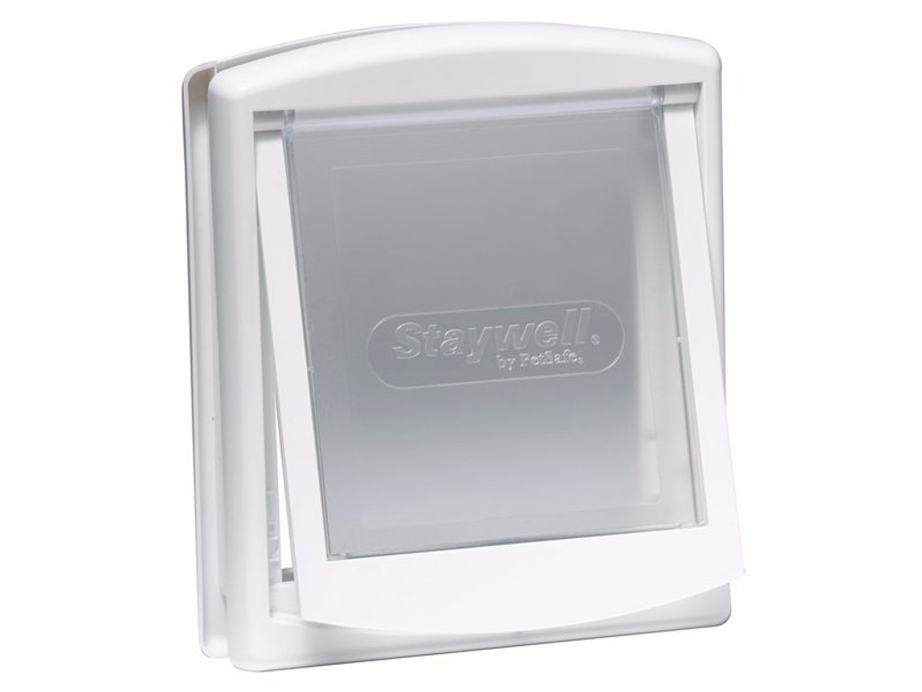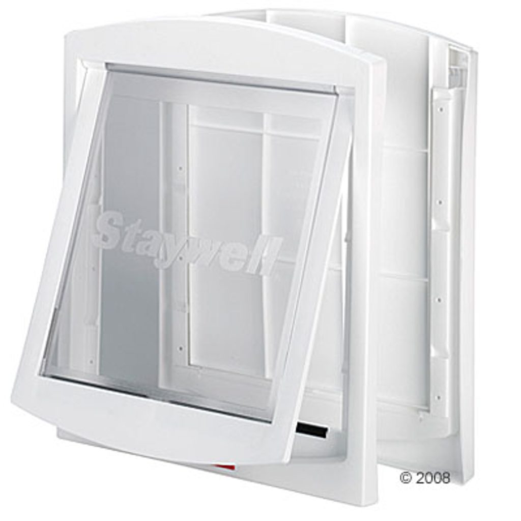 Staywell 760 original puerta de paso, blanca con apertura manual y trampilla extraíble con cerradura. La puerta de paso permite a su gato o perro pasar de un lado a otro con comodidad y libertad. Adecuada para perros pequeños, medianos y grandes de hasta 45 kg.